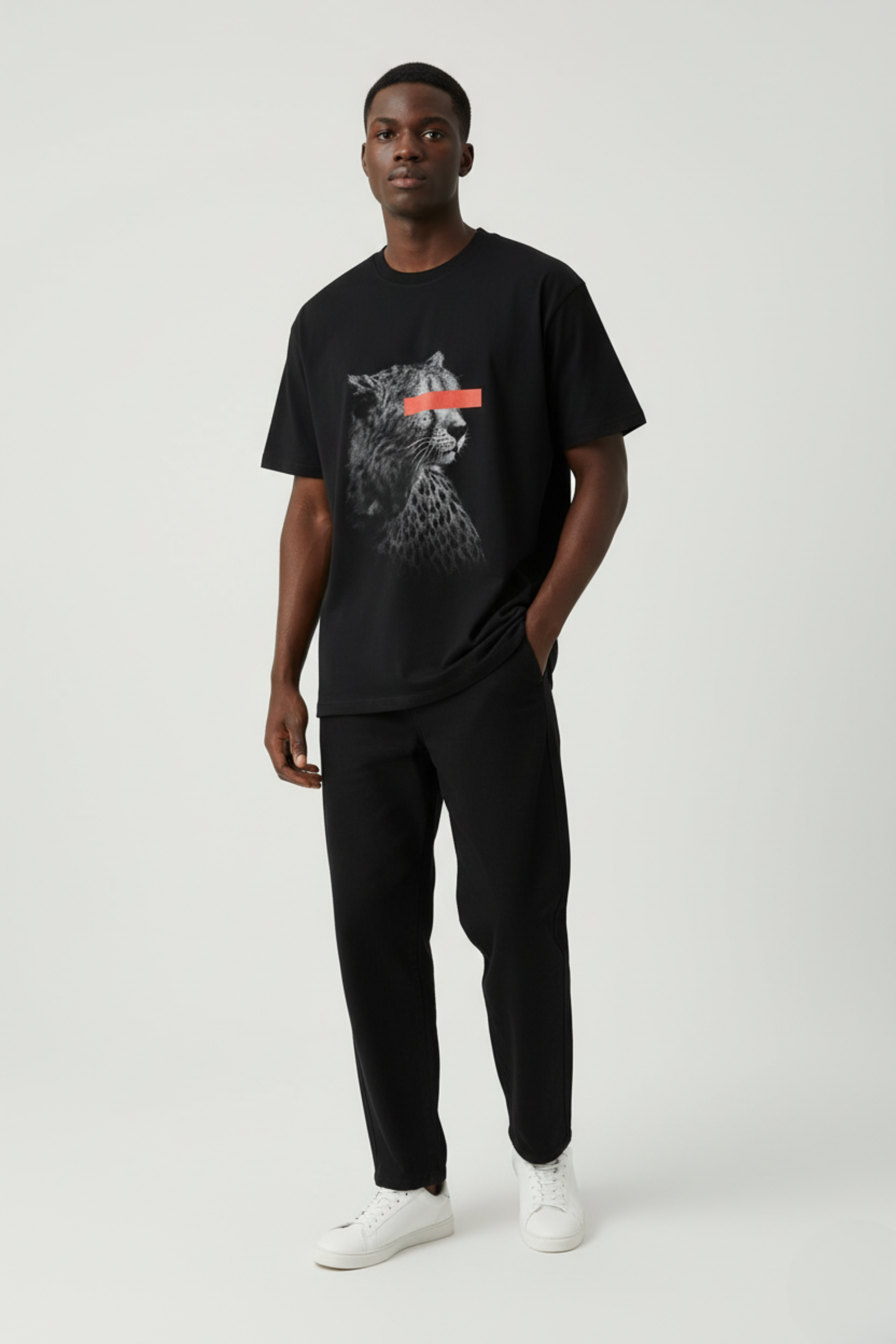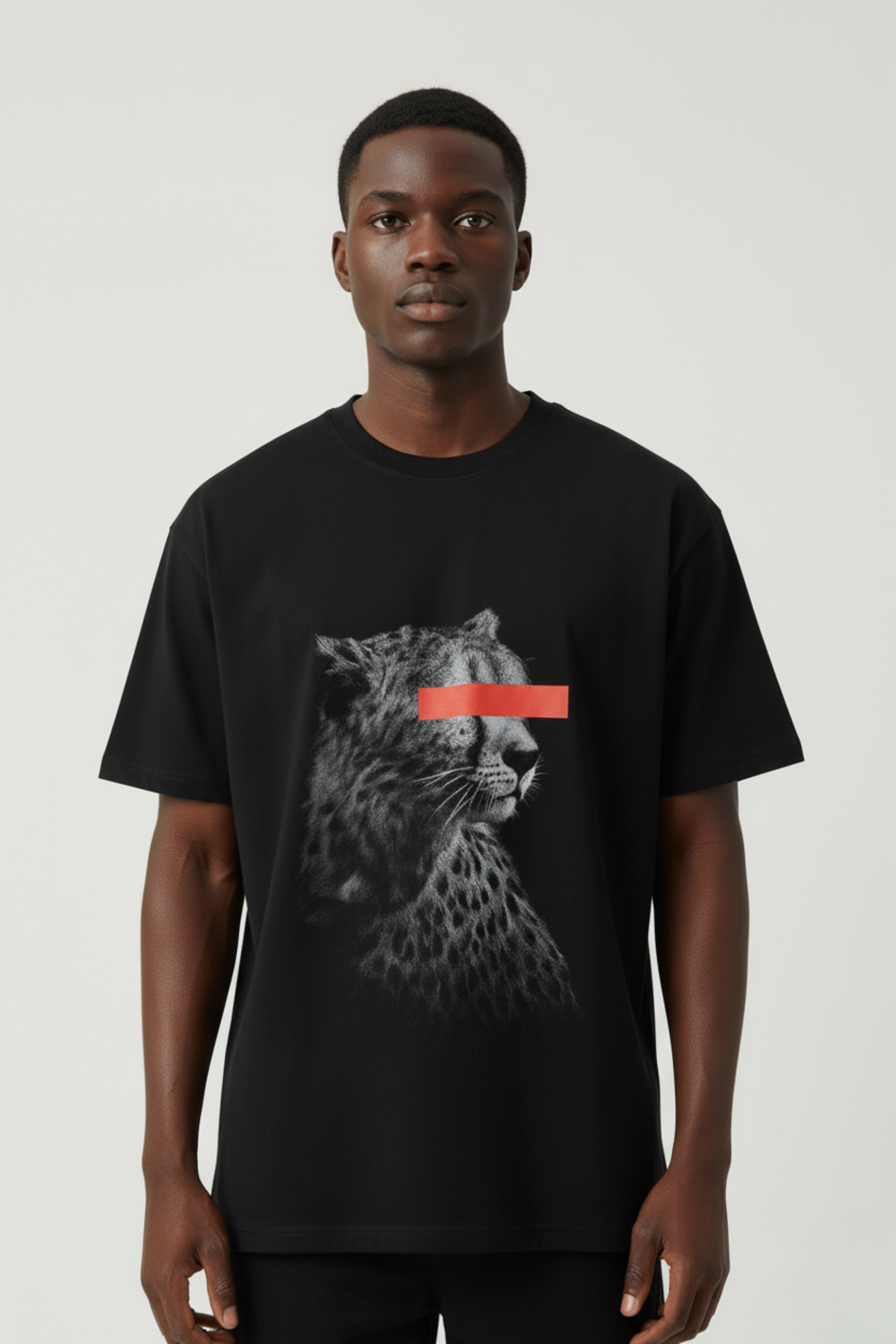 Make a statement without saying a word. This premium black T-shirt features a striking monochrome cheetah graphic, accented with a bold red stripe across the eyes — a symbol of power, mystery, and fearless individuality.