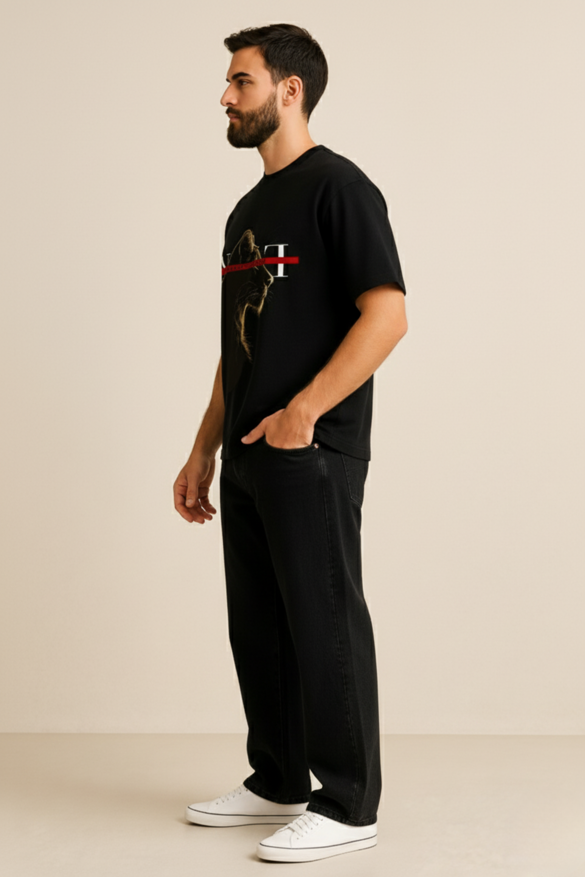 Make a statement without saying a word. This premium black T-shirt features a striking monochrome graphic, accented with bold red eyes — a symbol of power, mystery, and fearless individuality.