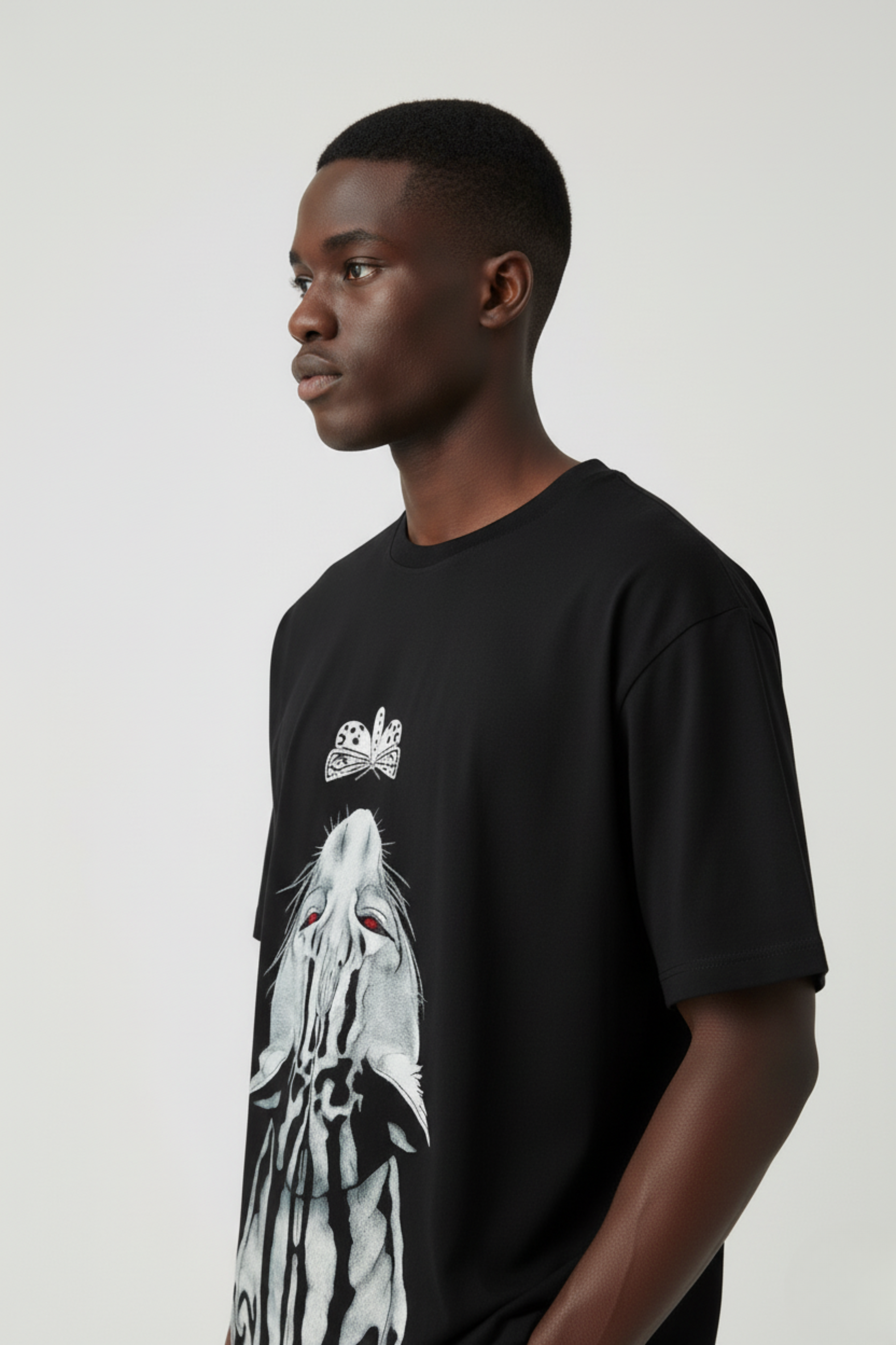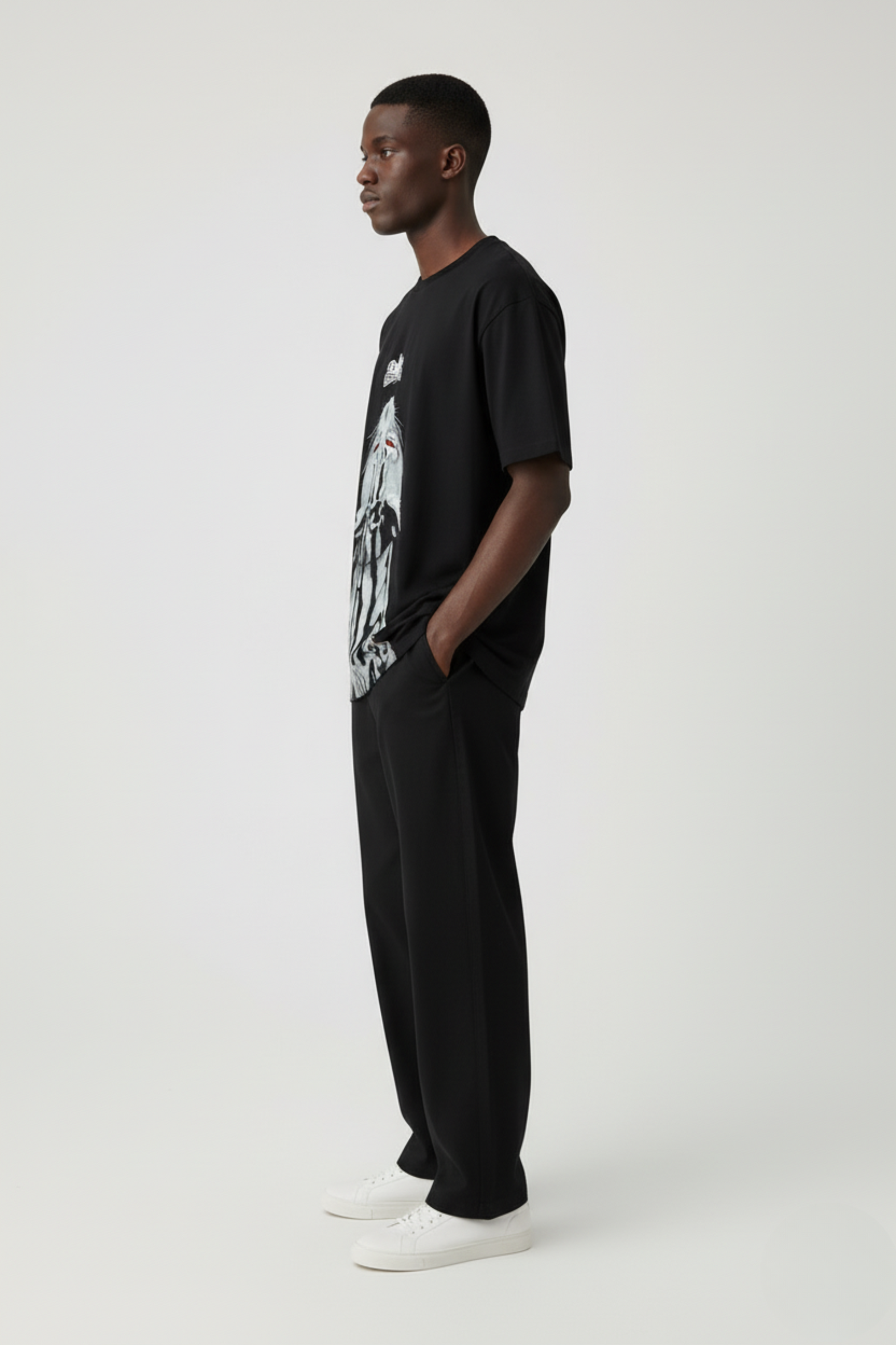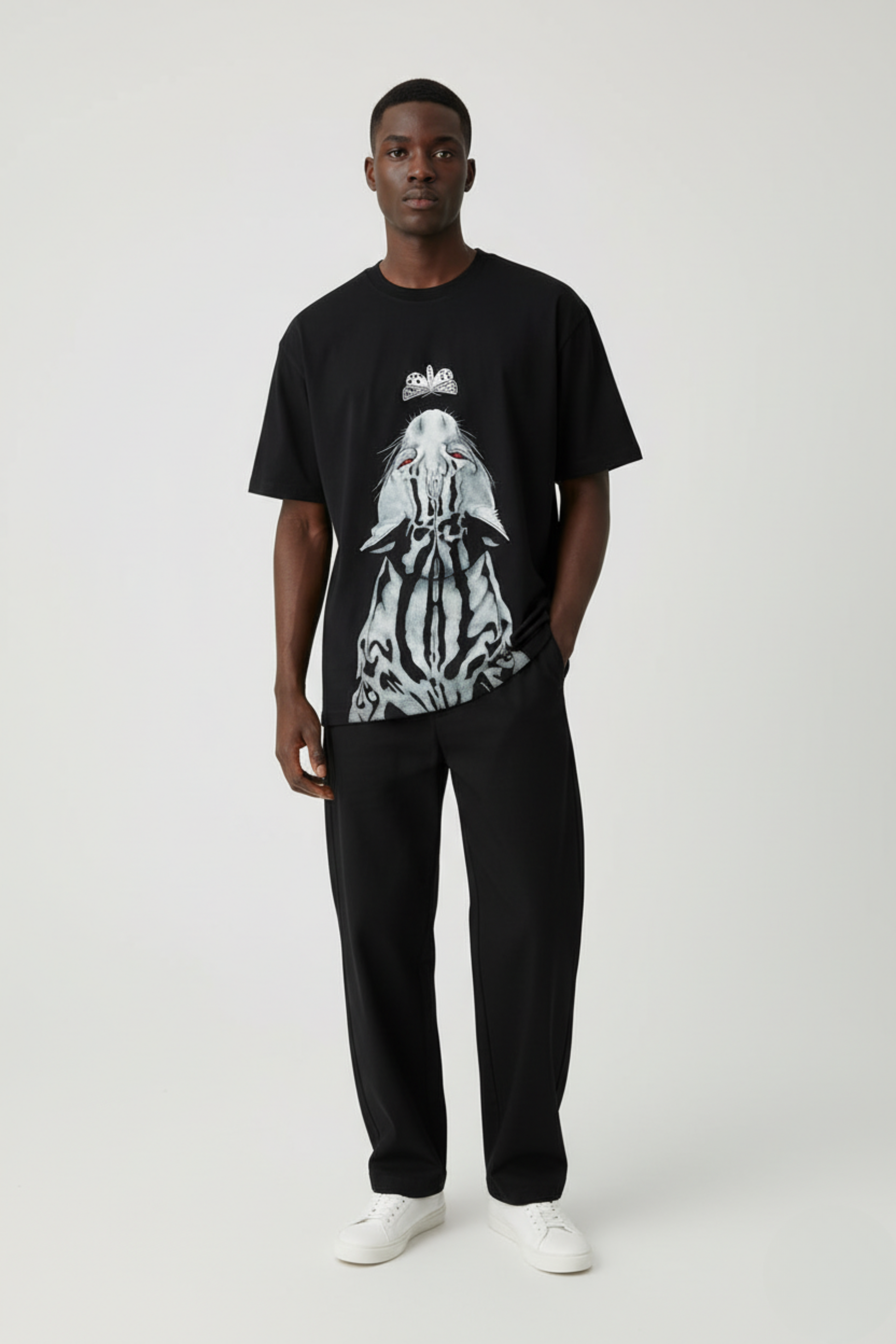 Make a statement without saying a word. This premium black T-shirt features a striking monochrome graphic, accented with bold red eyes — a symbol of power, mystery, and fearless individuality.