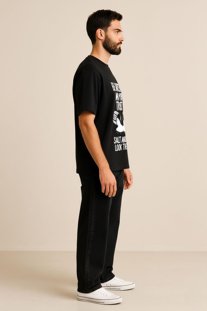 Say it without saying a word. From our Talk Tee To Me collection, this black oversized tee pairs minimal luxe design with cheeky, motivational one-liners. Premium cotton, relaxed drape, and a print that holds its edge—made for coffee runs, late nights, and everything in between.